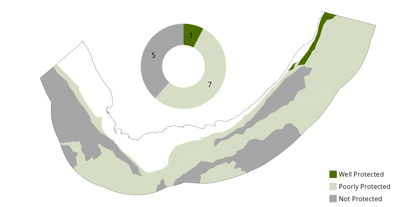 Only 20% of South Africa’s 163 marine ecosystem types are Well Protected. This statistic could be increased through increasing the estate of representative protected areas and by reducing pressures and thereby improving ecological condition within some existing MPAs. Well Protected ecosystem types include many from the Delagoa ecoregion where the iSimangaliso MPA and World Heritage Site provides protection to many ecosystem types. Other examples of Well Protected types include Agulhas Inner Shelf Reef, Natal Exposed Rocky Shore and seamount ecosystem types in the South east Atlantic.