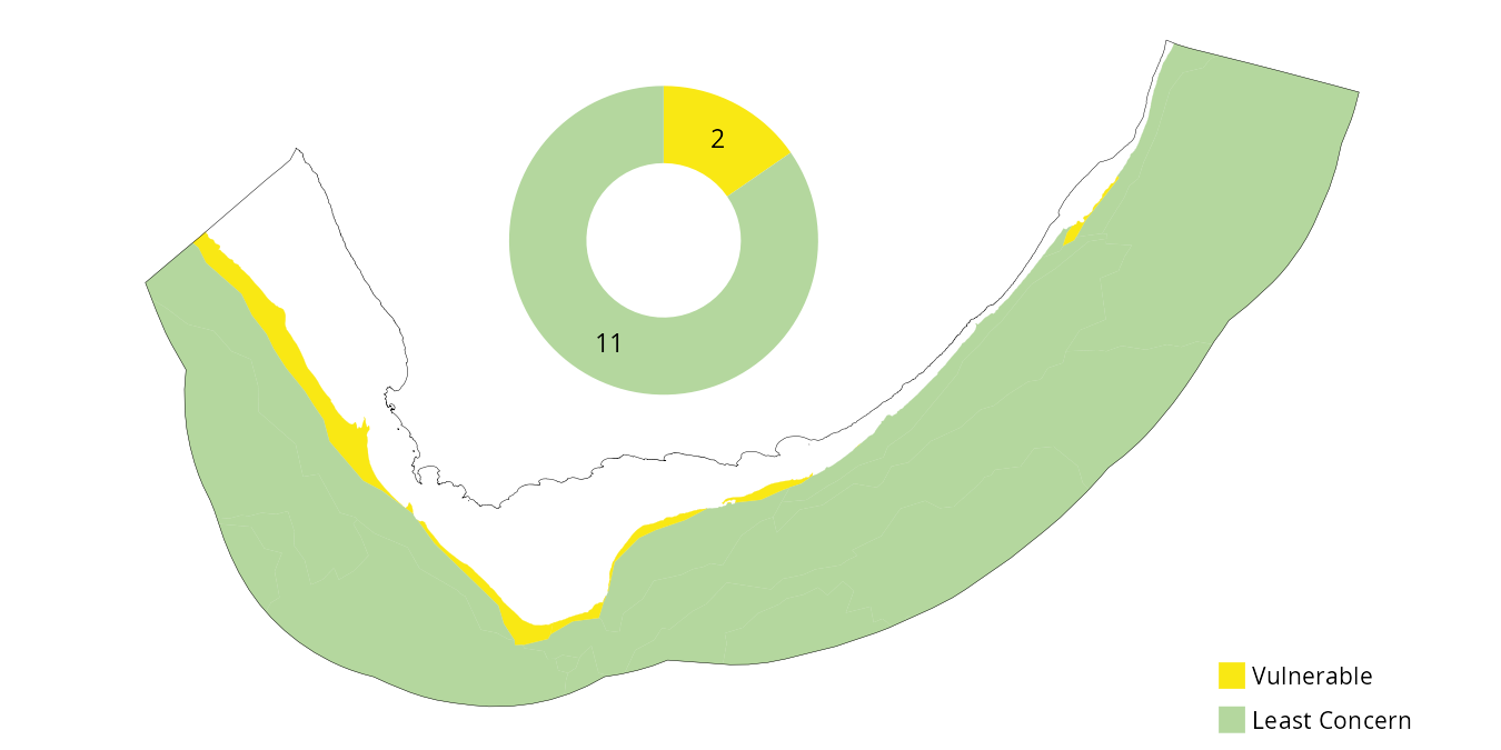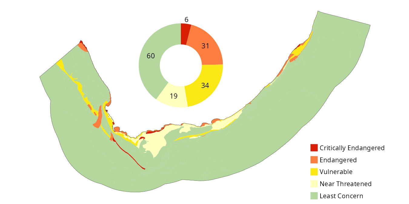 There are 31 Endangered ecosystem types (19%) which cover 0.9% extent of the marine realm area. Many of these are ecosystem types of limited extent that were uplisted (considered more threatened) relative to 2019 due to the application of global standards in 2025. For example, False and Walker Bay, St Helena Bay and Eastern Agulhas Bays (Algoa and St Francis) are all Endangered under either criterion B1 or B2 of the IUCN RLE.