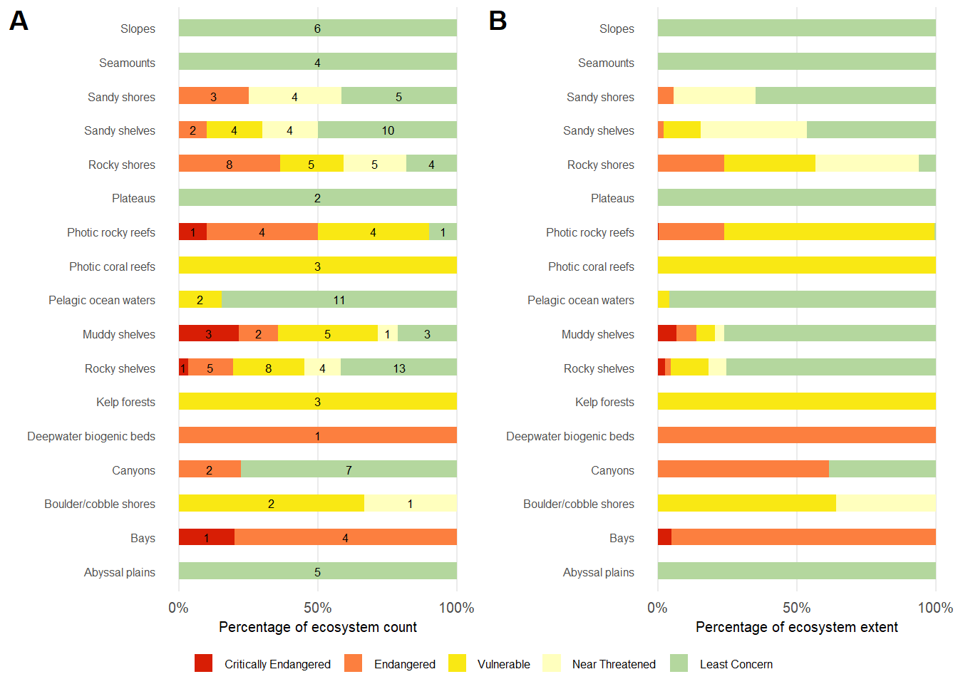 As pressure and condition data sets were not updated for the 2025 assessment, it is important to note that changes in ecosystem threat status are largely as a result of refined methods rather than recent loss or degradation in marine ecosystems. New aspects that were considered in the 2025 assessment included Criterion A, habitat loss, and Criterion B, number of threat defined locations, ongoing non-trivial drivers of ecological degradation (as opposed to pressures that have ceased) and stochastic events. Several ecosystem types have shifted into more threatened categories due to the ecosystem extent thresholds provided by the IUCN, but 13 ecosystem types had more positive (less threatened) results due to stricter thresholds for ongoing non-trivial decline in ecological condition.