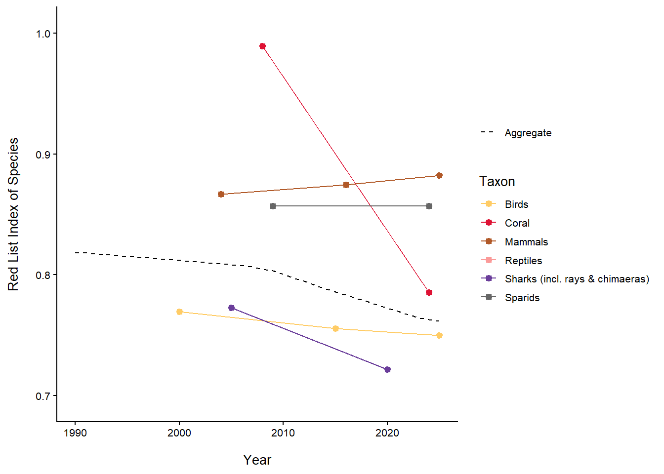 The trend in species IUCN Red List status over time was measured using the globally recognised indicator, the IUCN Red List Index (RLI). The RLI is calculated for specific taxonomic groups based on changes in Red List categories over time. The RLI value ranges from 0 to 1; if the value is 1, all taxa are Least Concern and if the value is 0, all taxa are extinct. The slope of the line connecting different assessment periods indicates the rate of change in the average RLI. Sharks, rays and chimaeras, sparids, and corals were included in the RLI for the first time in 2025.