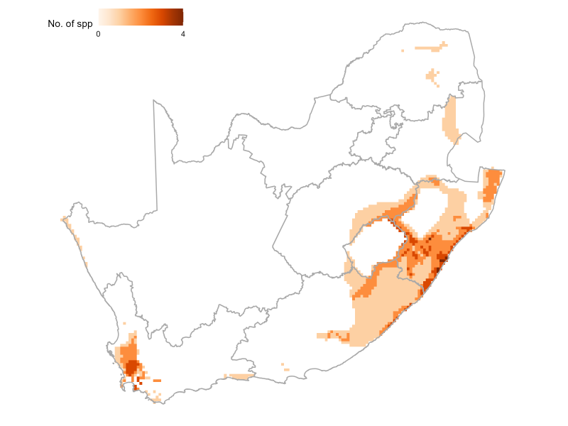 Almost 50% (17) of South Africa’s threatened species occur in the Western Cape province. Given the high endemicity within this province, and the disproportional number of endemic species that are threatened, this spatial pattern is not surprising. The Eastern Cape and KwaZulu-Natal provinces support four and six threatened species, respectively.