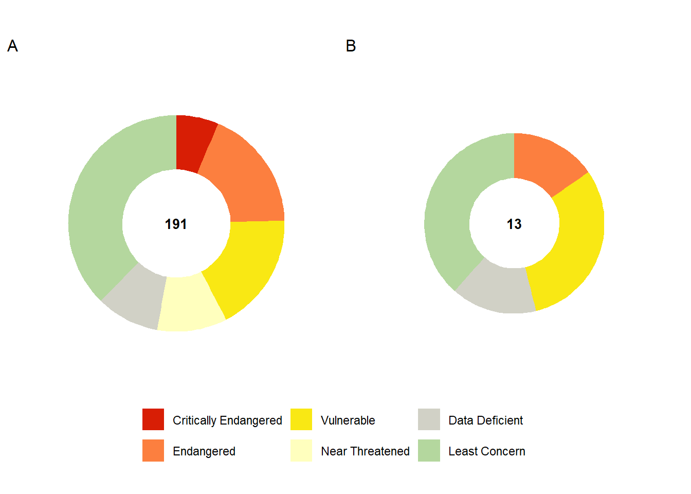 Forty-three percent (82 species) of these are threatened with extinction, with another 10% (20 species) assessed as Near Threatened.