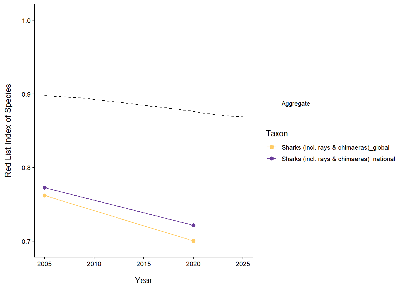 The shark RLI shows that many of South Africa’s shark species were already threatened in 2005 (Figure 2). The RLI declined further between 2005 and 2020, meaning that South Africa’s shark species continued to move towards extinction.