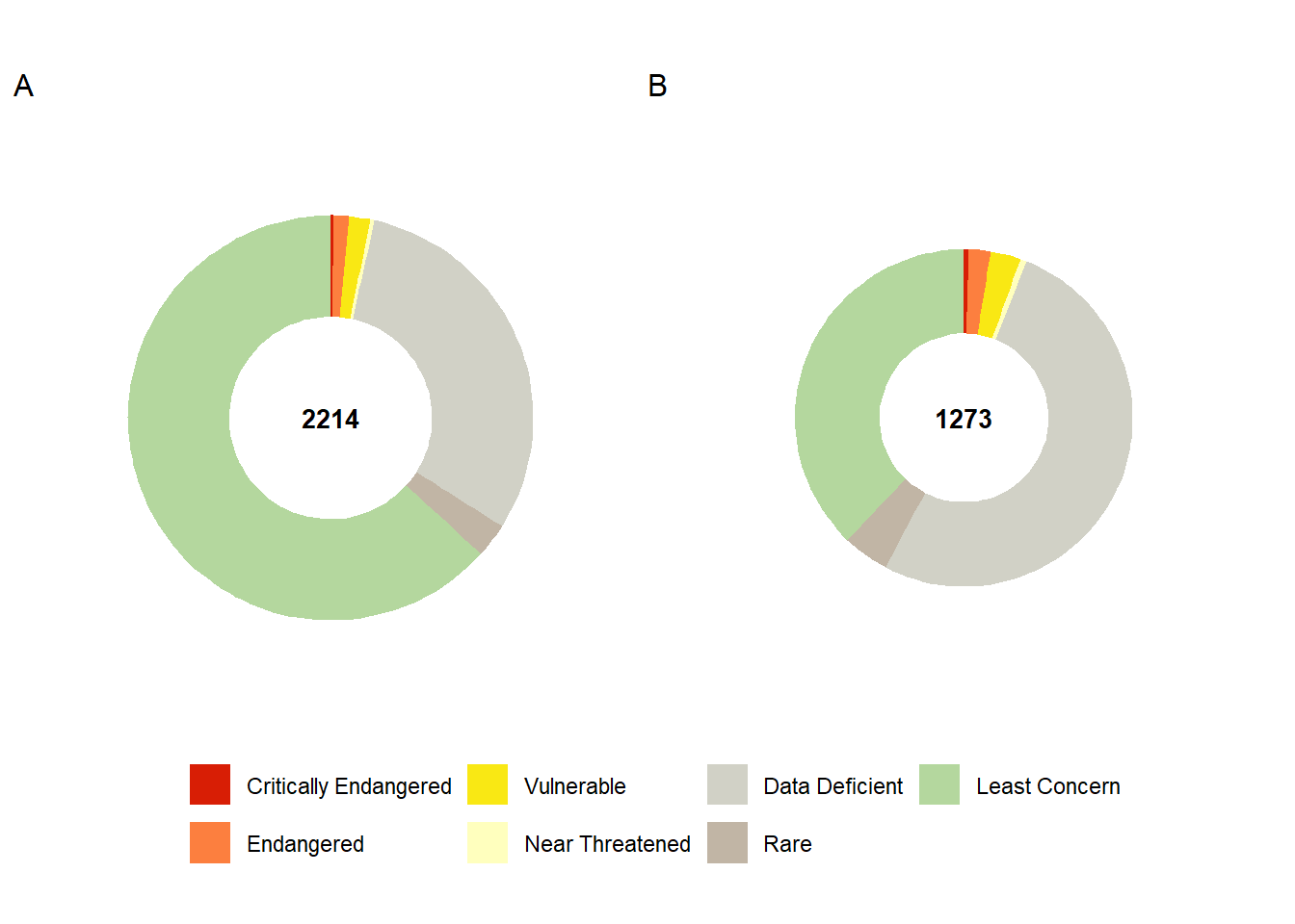 Importantly, almost a third of the species (707 spp., 32%) are assessed as Data Deficient, meaning that a large number of species need further research before their risk of extinction can be determined.