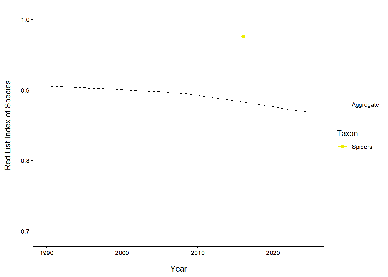 In the IUCN Red List Index (RLI) assessment, spiders currently have the highest RLI score of all South African taxonomic groups, making them appear the least threatened. However, many species remain unevaluated due to limited information. As a result, their true status is uncertain – more species may prove to be threatened, or many may be Least Concern. This uncertainty means the current RLI value should be interpreted with caution.