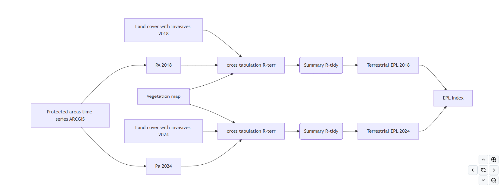 Terrestrial ecosystem protection level was calculated by assessing the degree to which protected areas targets for each ecosystem were met. Land cover, invasive alien plant data, terrestrial ecosystem maps (vegetation map) and protected areas maps for 2018 and 2024 were cross tabulated, allowing the calculation for each ecosystem type: i) the full extent of the type, ii) the full extent of the type within the PA network, iii) natural remaining the extent of the type within the PA network (including invaded areas), iv) the extent of invasion by alien plants within the PA network for each type.