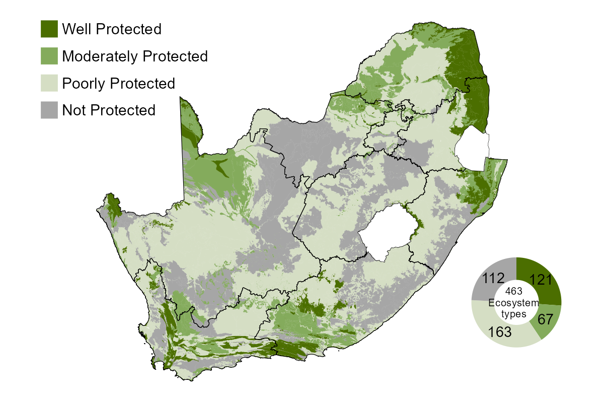 Over three-quarters (76%) of South Africa’s 463 terrestrial ecosystems received some form of statutory protection. However, levels of protection vary widely; 121 ecosystems are Well Protected, 67 are Moderately Protected, 163 are Poorly Protected and 112 are Not Protected.