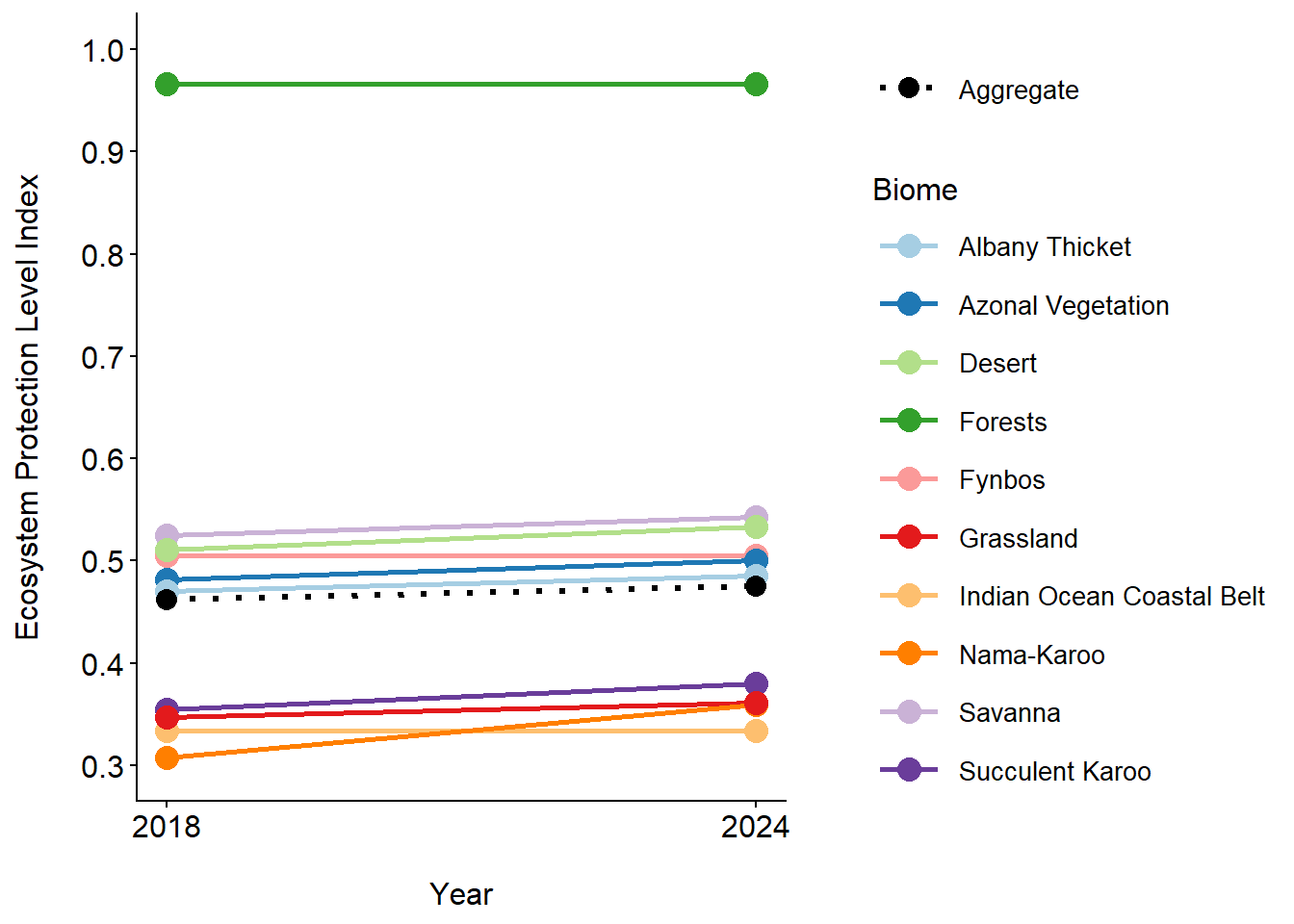 Ecosystem Protection Level can be tracked over time using the ecosystem protection level index (EPLI). The overall (aggregate) trend between 2018 and 2024 reflects the steady increase in the PA estate overall, mostly due to various biodiversity stewardship programs and the establishment of a new National Park in the Nama-Karoo (note the low level of protection for the Nama-Karoo and the more pronounced increase in protection level since 2018). The EPLI plot shows how well protected the Forest Biome is, but it also shows that that no increase in protection have occurred in the biome recently.