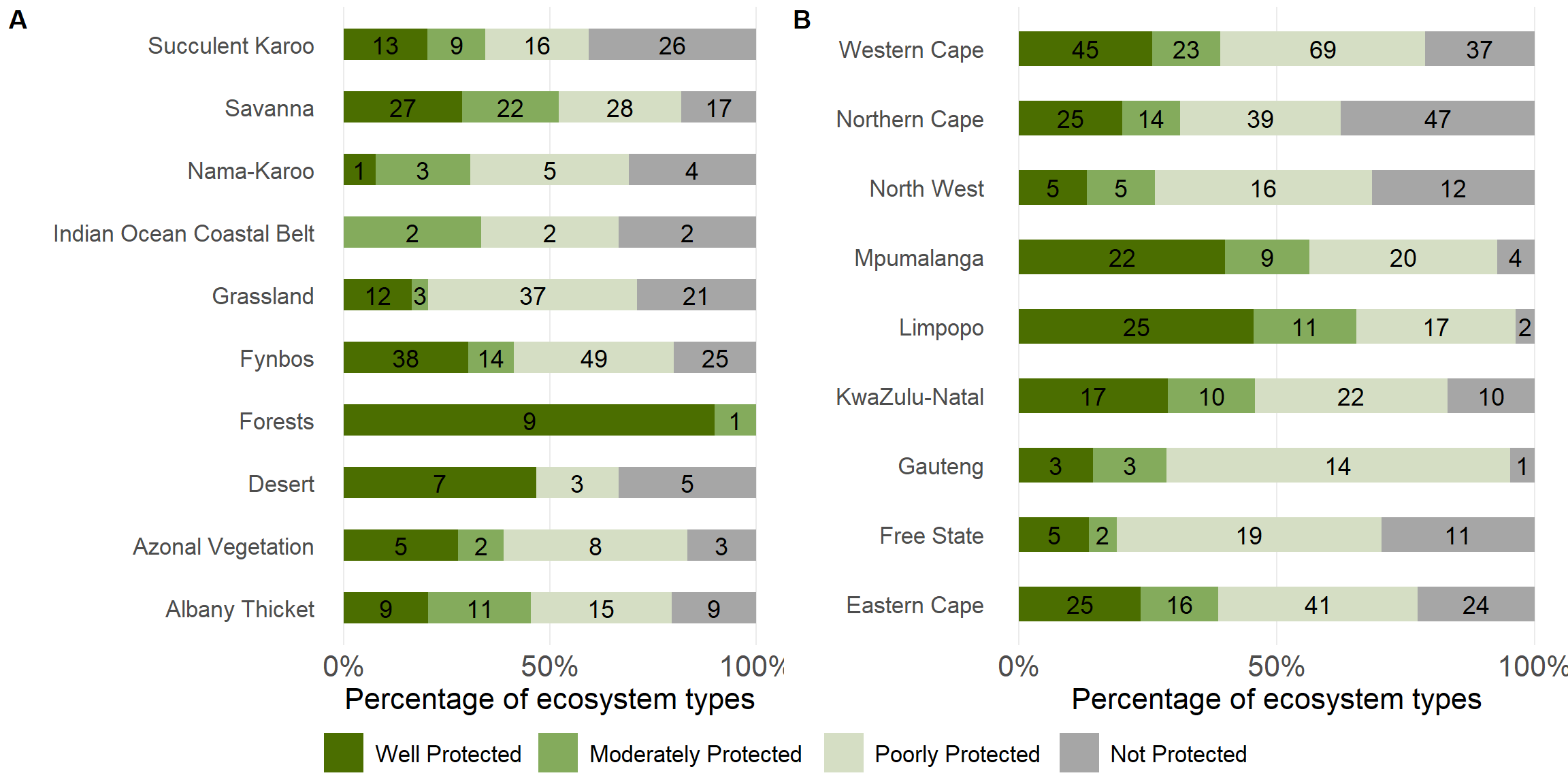 Ecosystem protection patterns at the provincial scale largely mirror those observed at the biome level. The Western Cape, Northern Cape, and Eastern Cape contain the highest numbers of under-represented ecosystems within the protected area network (Figure 3), many of which overlap with the Cape Floristic Region, a globally recognised biodiversity hotspot with exceptionally high ecosystem diversity. In contrast, provinces such as Gauteng and Limpopo, which have fewer ecosystems overall, still exhibit a high proportion of under-protected ecosystems (Figure 2), highlighting persistent gaps in representation even where total ecosystem numbers are lower.